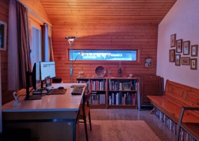 - A l’étage supérieur : séjour, bureau & bibliothèque, cuisine entièrement équipée, salle de bain avec douche, WC, lave-linge